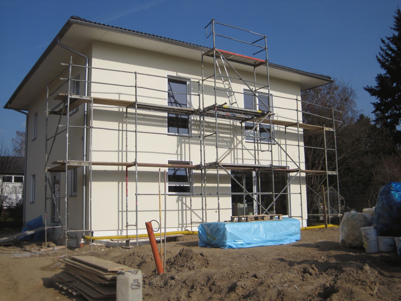 Am Wochenende haben wir das Grundstück besichtigt und waren leider „not amused“. Nachdem uns für die kommende Woche die Anlaufberatung für die Kellerstellung avisiert worden ist (aber noch nicht offiziell), hat sich leider wenig auf dem Grundstück getan. Wir hatten letzte Woche schon in Vorgriff darauf die Hausfirma und die Erdbaufirma zur Beseitung des angehäuften Mülls und des zurückgebliebenen Schutts aufgefordert. Leider wurde der Kram nur zusammengestellt aber nicht entsorgt. Also ist mal wieder eine Beschwerde in verschärfter Form nötig. Die ganze Sache nervt umso mehr, als dass ich die Entsorgung des alten Wasserschachts schon vor Monaten bezahlt habe. Meine Geduld ist am Ende – und wir haben noch nicht einmal richtig angefangen mit dem eigentlichen Bauen! Das kann ja eiter werden!