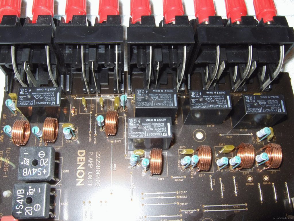 Ja so ist das mit alten Schätzchen. Irgendwann kommen sie mal in die Jahre und die Zipperlein treten auf. Leider auch so bei meinem Denon 3808A. Ab und zu fällt beim Einschalten ein Lautsprecherausgang aus, nach mehrmaligem EIn- und Ausschalten oder Wechsel der Eingangsquelle funktioniert das dann wieder – bis zum nächsten Mal. Nach Studium diverser Foren kristallisieren sich die Laustsprecherschutzrelais als Fehlerquelle heraus. Dies betrifft nicht nur dieses Gerät, sondern auch viele andere Geräte verschiedener Hersteller. Also flugs das Service-Manual aus dem Internet besorgt und mal nachgesehen. Und siehe da, es ist je Kanal ein solches Schutzrelais verbaut. Leider gibt die Bezeichnung im Service-Manual nicht viel her, das es diese Type nur als Originalersatzteil bei Denon gibt – oder auch nicht mehr gibt. Und wenn ja, dann zu exorbitant hohen Preisen bei irgendwelchen Versendern oder in der Bucht. Dem Schaltplan kann man entnehmen, dass es sich bei dem fraglichen Relais um einen Typ mit zwei Schliessern handelt. Da hilft dann leider nur noch aufschrauben. Und das ist gar nicht so einfach, da der 3808A ziemlich verbaut ist, und die Relais auch noch auf der untersten Platine sitzen, sodass zum Wechsel der Relais das gesamte Gerät komplett verlegt werden muss! Daher ist hier nun ein Wort der Warnung angebracht.