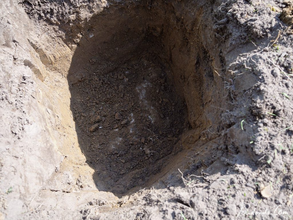 Leider ist unser schöner Apfelbaum, der uns immer mit tollen Äpfeln beschenkt hat, dieses Jahr eingegangen. Offensichtliche Schäden waren nicht festzustellen, aber vielleicht hat er doch damals beim Umfallen Schäden davongetragen, die sich jetzt erst ausgewirkt haben, oder er hat die Trockenheit im letzten Jahr nicht verkraftet. Also habe ich einen neuen Baum derselben Sorte „Topaz“ besorgt und den neuen Baum dann an anderer Stelle eingepflanzt. Leider stellte sich heraus, das die gewählte Stelle über den Resten der alten Baustrasse liegt, sodass ich mit schwerem Gerät anrücken musste, um ein entsprechendes Pflanzloch auszuheben. Elende Plackerei!