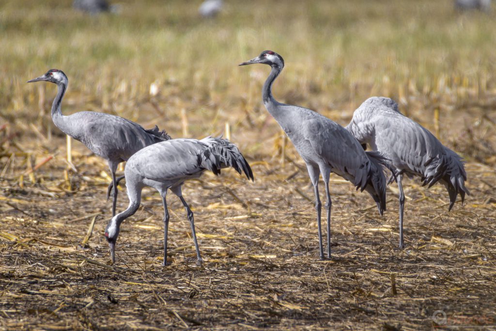 Ich kann es nicht leugnen, ich bin immer wieder von den Kranichen fasziniert. Und so habe ich mich ein zweites Mal nach Brandenburg aufgemacht, um die Kraniche zu fotografieren. Und wieder hatte ich Glück mit entspannten Kranichen, die in grosser Zahl auf den Feldern standen und sich fotografieren liessen. An einer Stelle kam ich ganz nah heran, hatte mich allerdings auch hinter Maispflanzen versteckt, und konnt nur zwischen den Pflanzen hindurch fotografieren. Aber da kam ich mir doch wie ein richtiger Tierfotograf vor. Ich habe nicht gewagt, mich dort aus dem Versteck zu bewegen um besser fotogragieren zu können, da ich die Kraniche nicht stören wollte. Daher habe es dabei belassen und mich nach dem Fotografieren wieder still und heimlich zurückgezogen. Ein tolles Erlebnis!