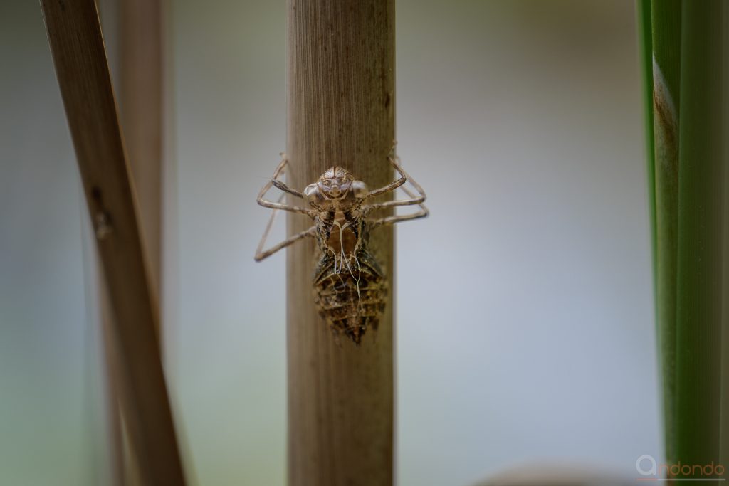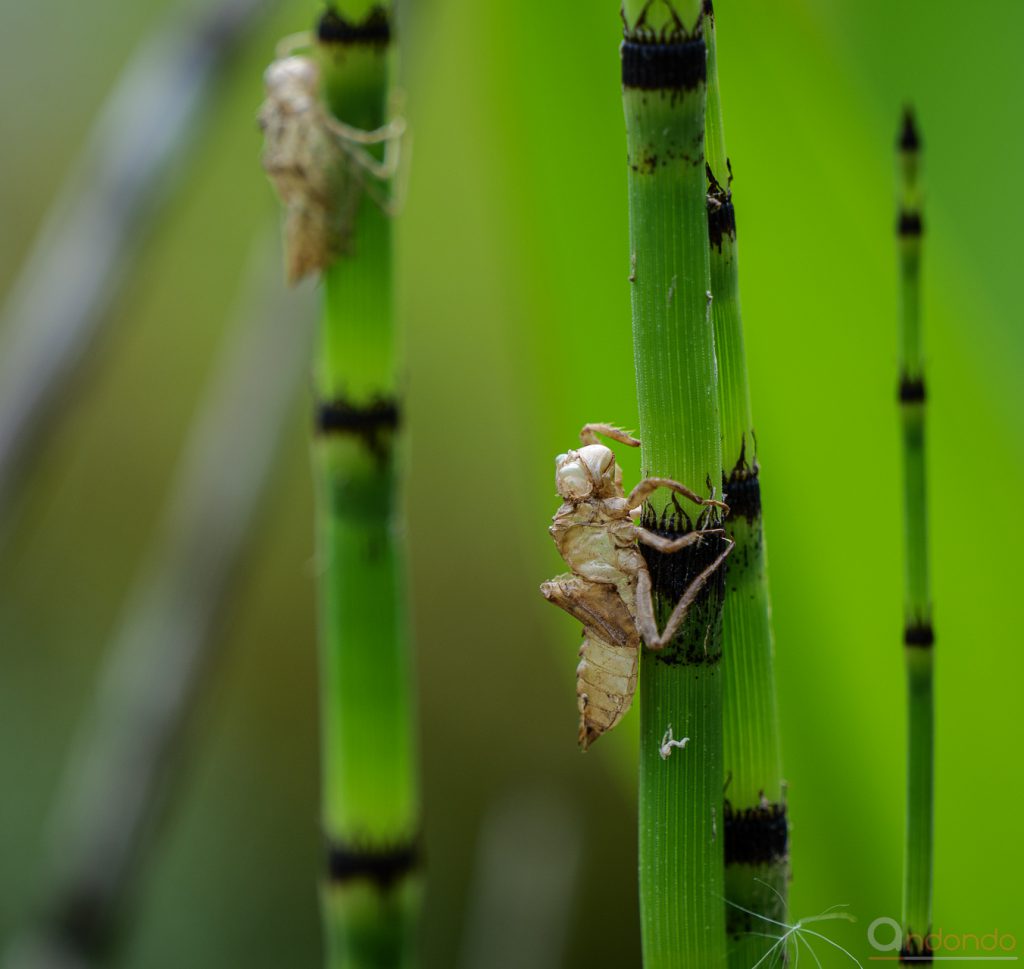 Nach dem nächtlichen Regen zeigten sich die verschiedenen Pflanzen im Teich über und über von seltsamen, fast ausserirdisch anmutenden, Gebilden übersäät. Libellen waren in den frühen Morgenstunden geschlüpft und hatten nur ihre Exuvien (Libellenhaut, Larvenhaut) zurückgelassen.