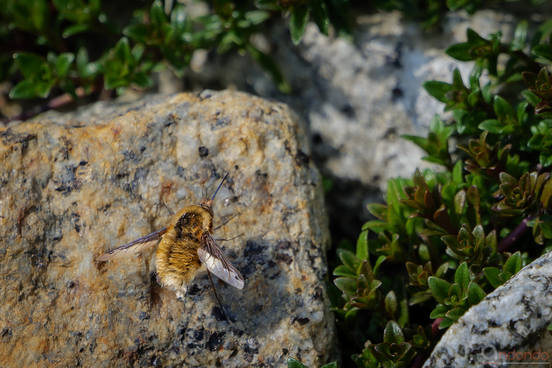 Der heutige Tag startete zwar sehr kalt mit Nachtfrost und niedrigen Temperaturen, die Sonne aber schien den ganzen Tag von einem blauen Himmel und der beginnende Frühling lockte die ersten Insekten in den Garten. Die gehörnten Mauerbienen waren schon eifrig am Insektenhotel unterwegs und auch ein Zitronenfalter verweilte für eine kleine Nektarmahlzeit an einer Löwenzahnblüte. Und zum ersten Mal konnte ich bei uns im Garten den großen Wollschweber (Bombylius major) beobachten, der die Sonne an den warmen Steinen der Kräuterspirale genoß. Leider waren auch unerwünschte Gäste im Garten anzutreffen. Das Lilienhähnchen war schon wieder mit seinem zerstörerischem Werk an meinen frisch ausgetriebenen Lilien zu Gange.