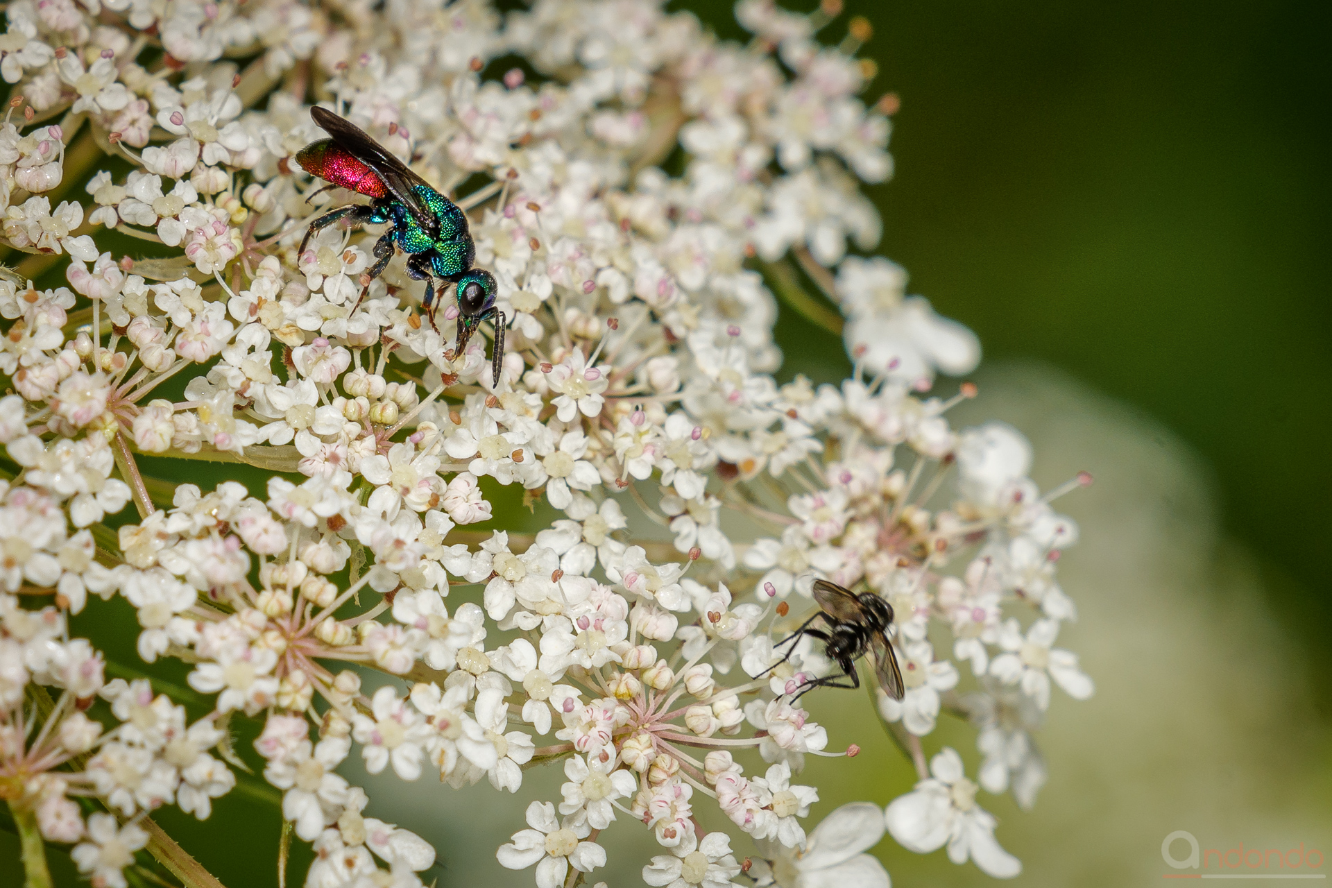 Ich bin ja ein Fan der Goldwespen, die zur Zeit häufig in meiner Blumenwiese umherfliegen. Leider sind die aber auch ziemlich flink, sodass sich das Fotografieren etwas herausfordernd gestaltet. Heute aber war kurz vor dem Regen die Situation komplett anders. Eine Wespe hatte sich schon an einer abgeblühten Wilden Möhre angeklammert und andere Wespen waren sehr langsam auf Nektarsuche und wieder andere Insekten schienen nur noch auf den Regen zu warten.