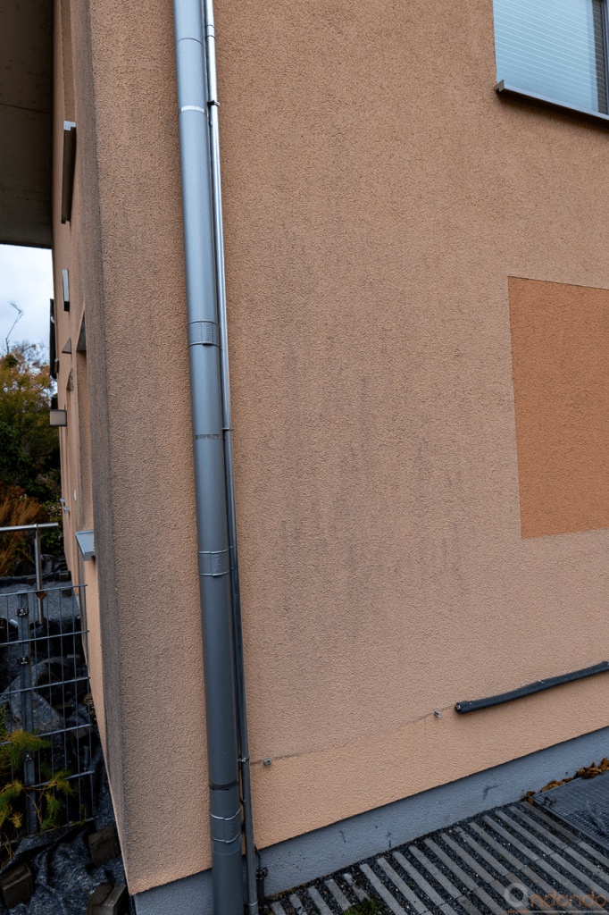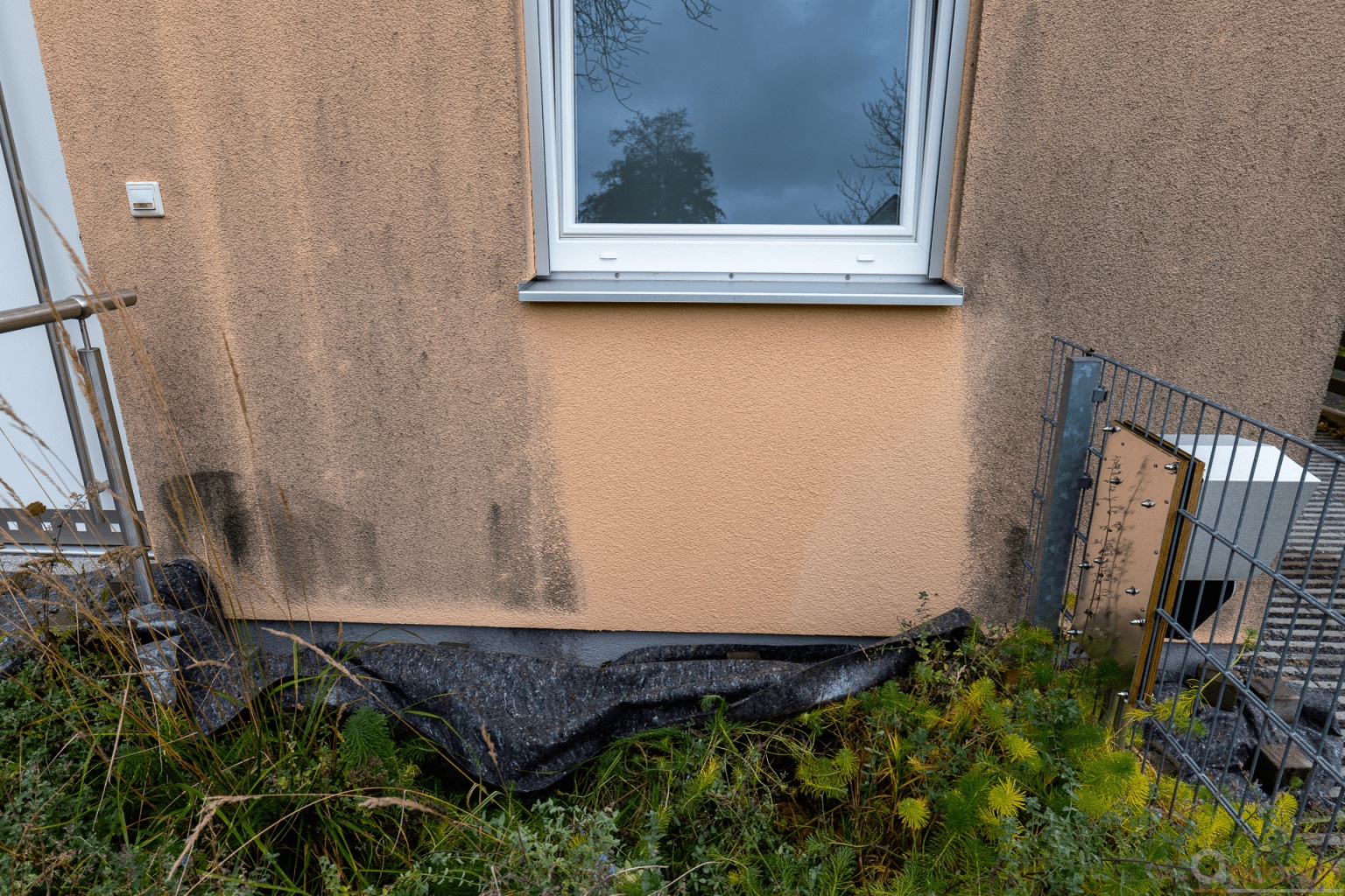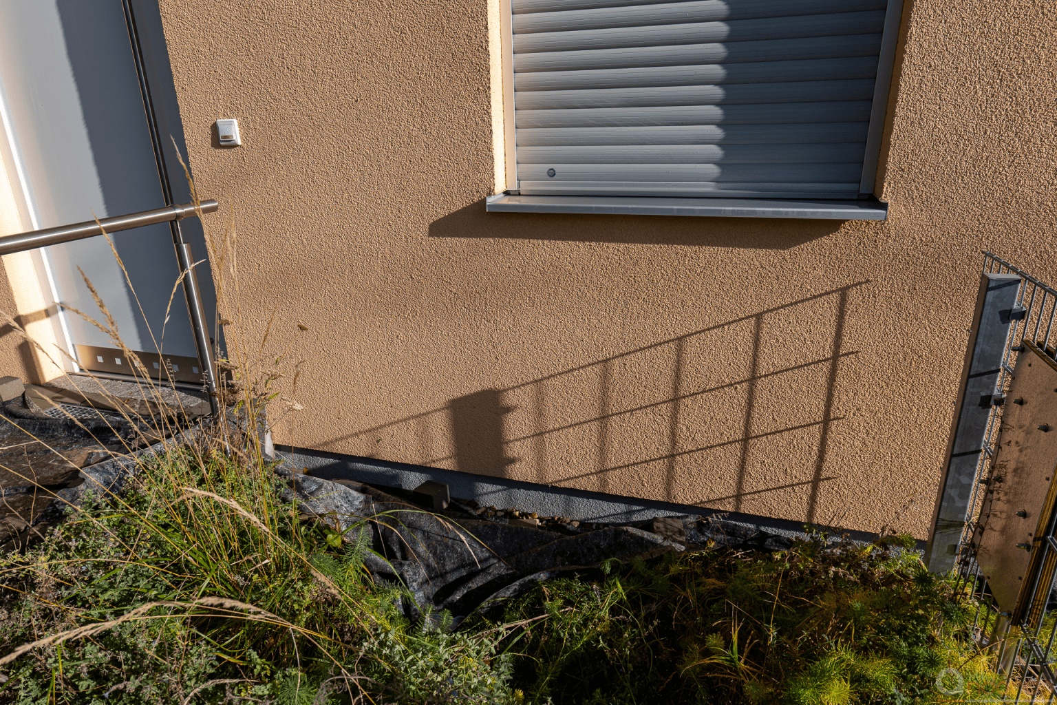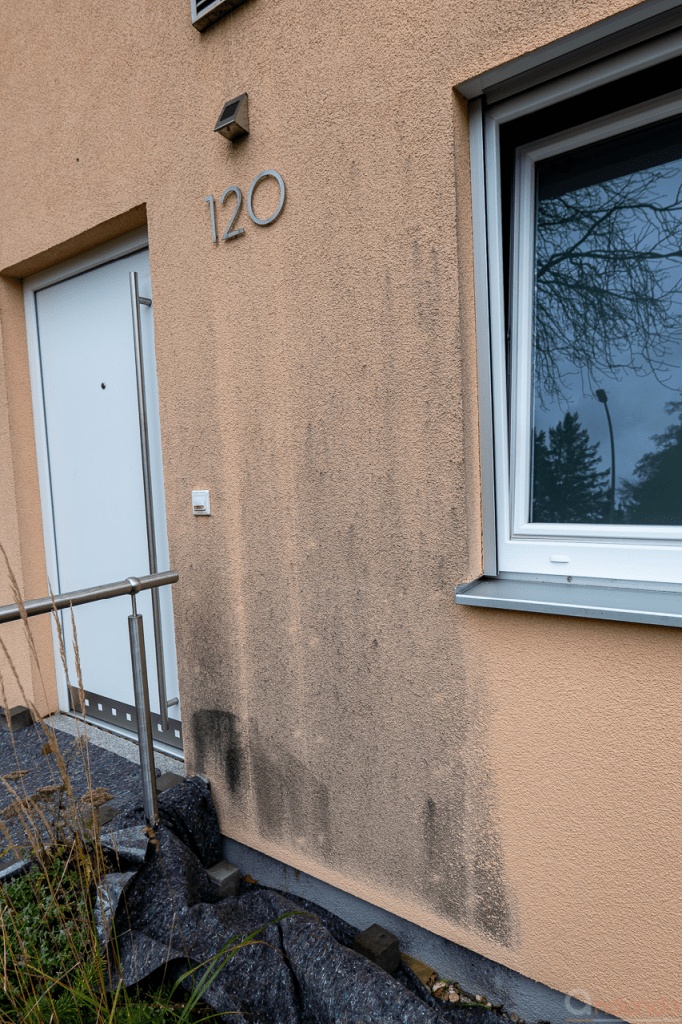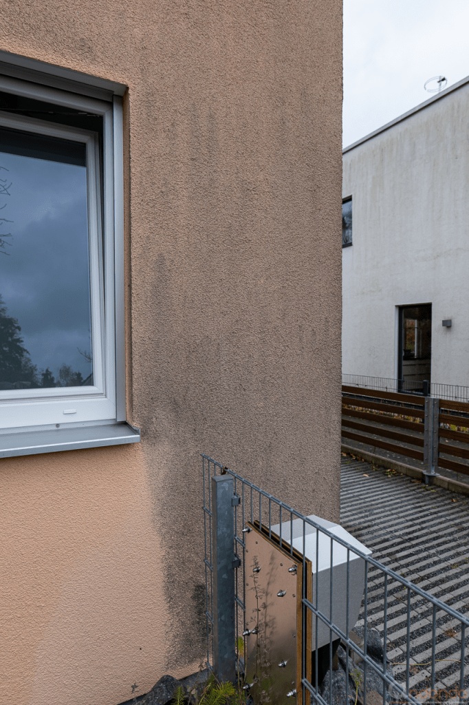 Leider hat unser kleines Schmuckstück im Laufe der Jahre durch die Be- und Entlüftungsanlage und den Verkehr der Straße optisch etwas gelitten, sodass wir uns schon mehrfach mit einer Fassadenreinigung beschäftig hatten. Die Vorderseite war über die Jahre doch schon sichtbar verschmutzt, die Seiten hingegen waren noch akzeptabel. Da machte sich dann doch der Dachüberstand und auch die sich hier nicht auswirkende Entlüftung bemerkbar. Aber wie so oft kam immer wieder etwas dazwischen, und die notwendigen Arbeiten verschoben sich immer wieder. Aber wie der Zufall es wollte, sprach mit unser Nachbar an, dass er eine Reinigung für sein Haus plane und schon einen Kontakt mit einem entsprechenden Betrieb aufgenommen habe und ob ich das nicht auch machen wolle. Da habe ich dann natürlich zugestimmt und nach einigen Tagen rückte auch schon die Reinigungsfirma an. Und was soll man sagen? Die Firma hat einen super Job gemacht und unser Haus erstrahlt wieder wie neu. Da wollte sich auch die Sonne an diesem trüben Tag nicht lumpen lassen, durchbrach flugs den Hochnebel, und ließ das fisch gereinigte Haus im Sonnenlicht funkeln und strahlen!