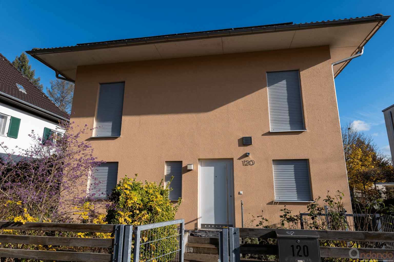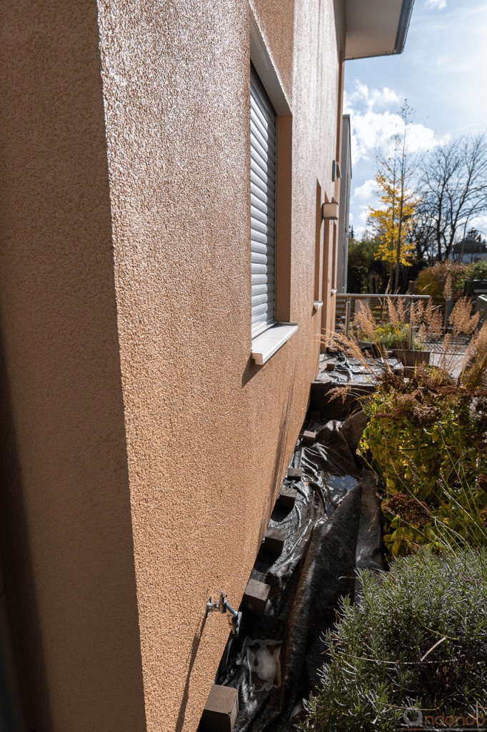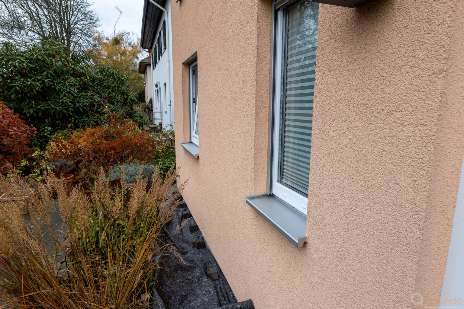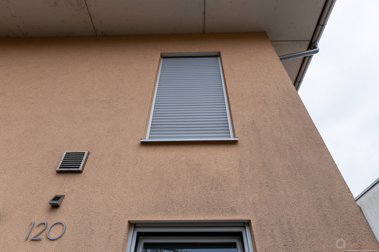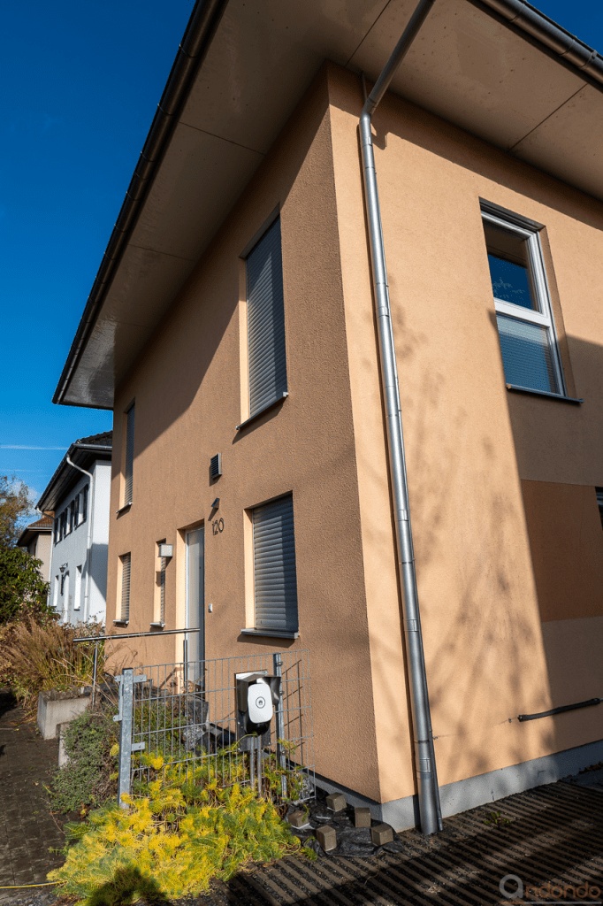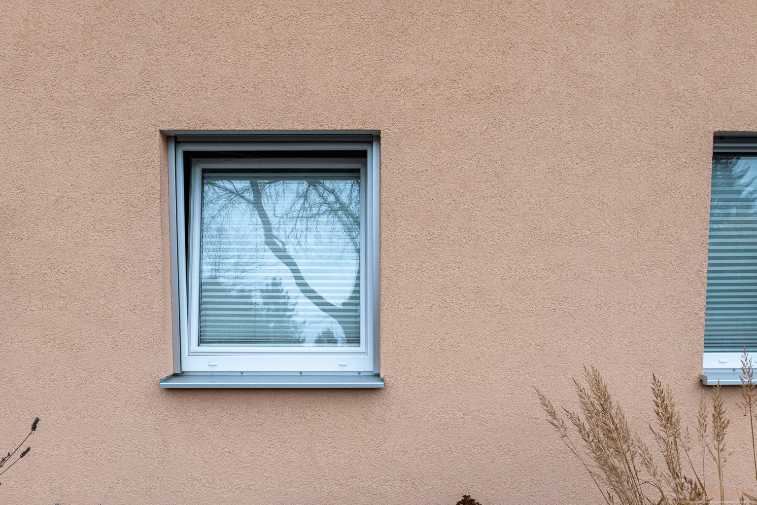 Leider hat unser kleines Schmuckstück im Laufe der Jahre durch die Be- und Entlüftungsanlage und den Verkehr der Straße optisch etwas gelitten, sodass wir uns schon mehrfach mit einer Fassadenreinigung beschäftig hatten. Die Vorderseite war über die Jahre doch schon sichtbar verschmutzt, die Seiten hingegen waren noch akzeptabel. Da machte sich dann doch der Dachüberstand und auch die sich hier nicht auswirkende Entlüftung bemerkbar. Aber wie so oft kam immer wieder etwas dazwischen, und die notwendigen Arbeiten verschoben sich immer wieder. Aber wie der Zufall es wollte, sprach mit unser Nachbar an, dass er eine Reinigung für sein Haus plane und schon einen Kontakt mit einem entsprechenden Betrieb aufgenommen habe und ob ich das nicht auch machen wolle. Da habe ich dann natürlich zugestimmt und nach einigen Tagen rückte auch schon die Reinigungsfirma an. Und was soll man sagen? Die Firma hat einen super Job gemacht und unser Haus erstrahlt wieder wie neu. Da wollte sich auch die Sonne an diesem trüben Tag nicht lumpen lassen, durchbrach flugs den Hochnebel, und ließ das fisch gereinigte Haus im Sonnenlicht funkeln und strahlen!
