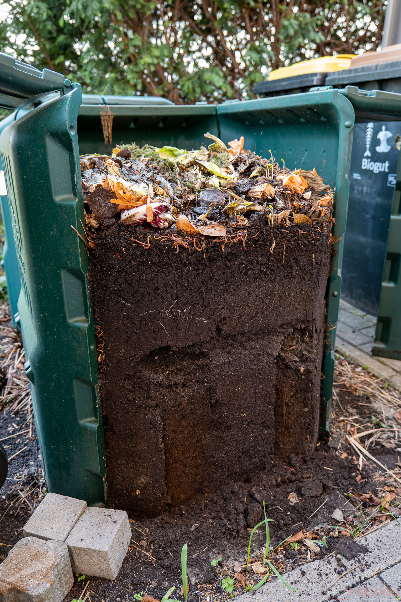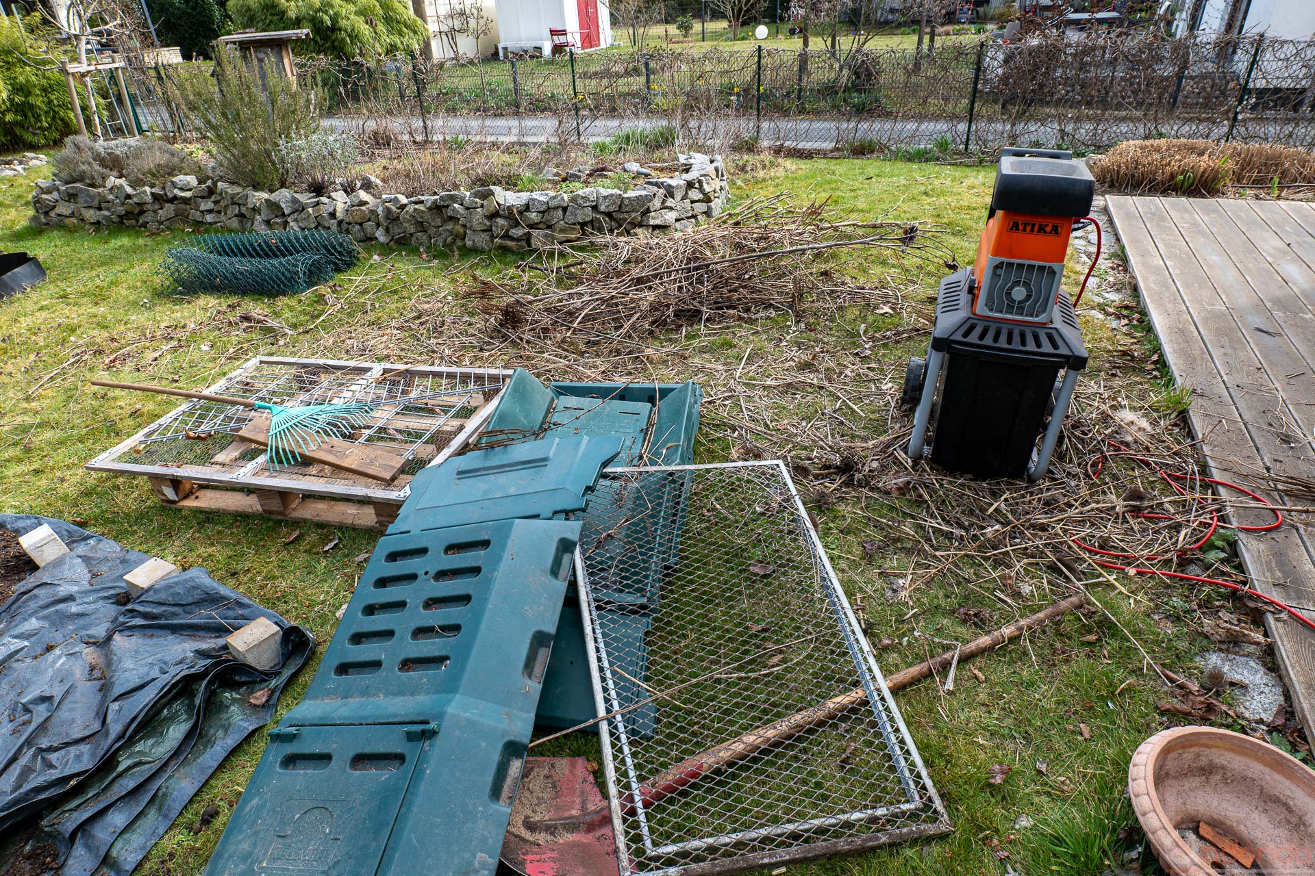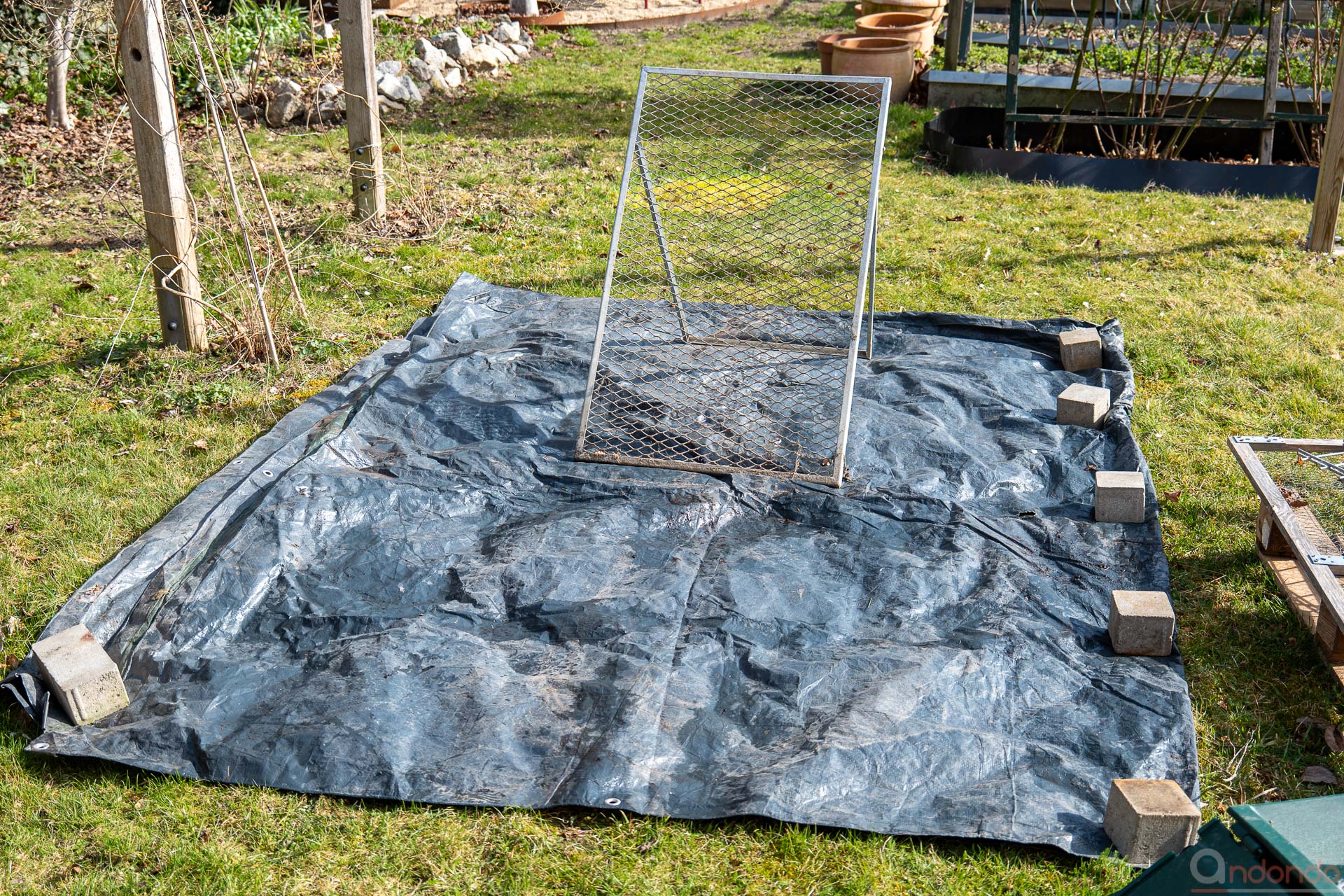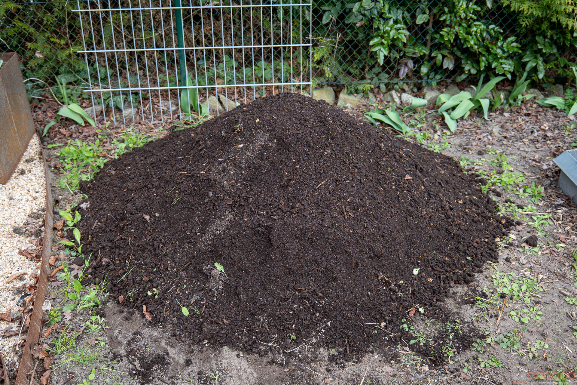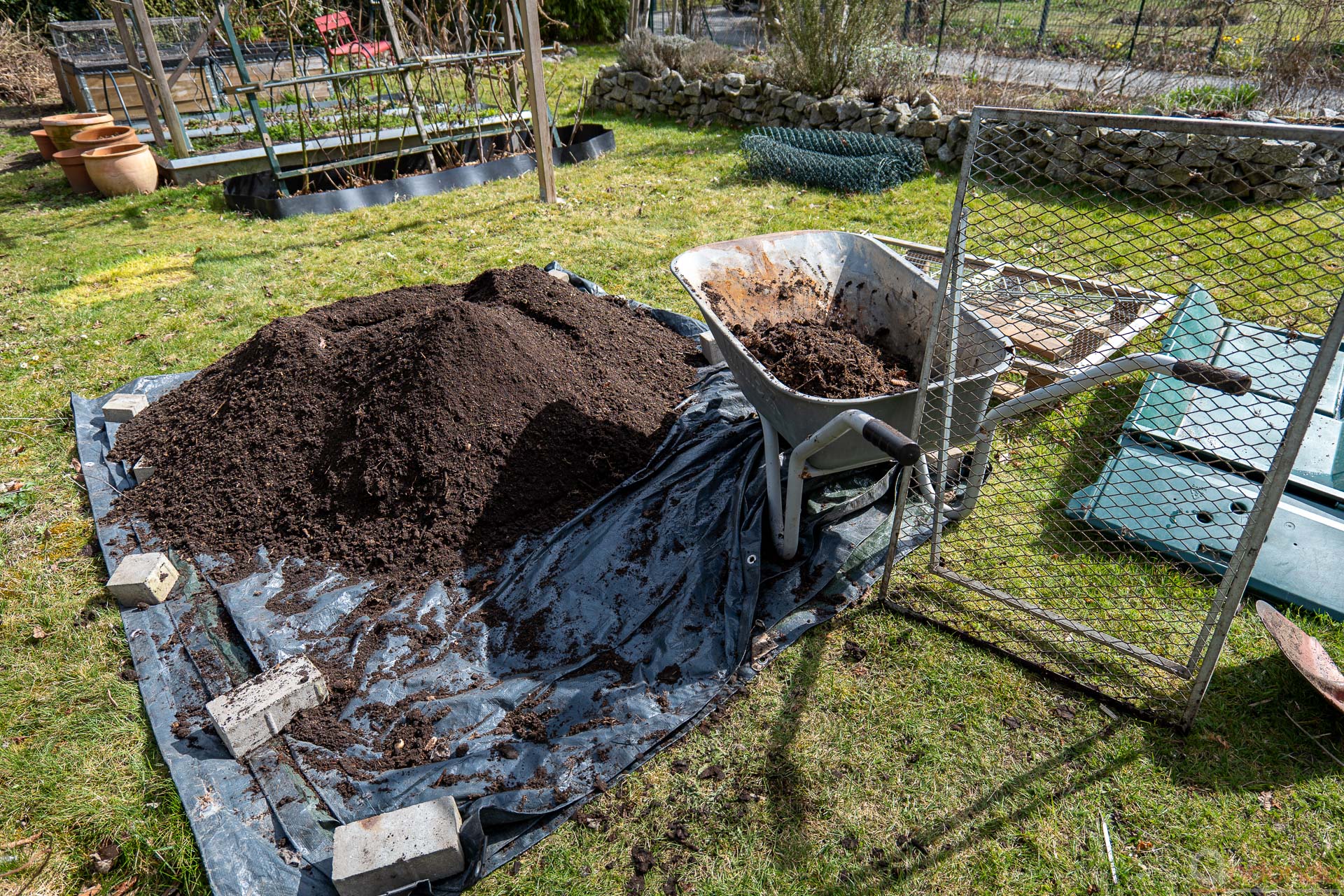 Also habe ich eine Plane auf dem Rasen ausgebreitet, mein Durchwurfsieb aufgestellt und habe den Kompost dann aus dem Komposter auf den Rasen gekarrt und durch das Sieb geschaufelt. Das Ergebnis war fast ein Kubikmeter feister, reifer Kompost, umgangssprachlich auch gerne als „Gärtnergold“ bezeichnet. Daneben habe ich auch noch die Reste vom Aufräumen des Staudenbeets geschreddert und der Biotonne übergeben, damit ich an deren Stelle den Kompost lagern konnte.