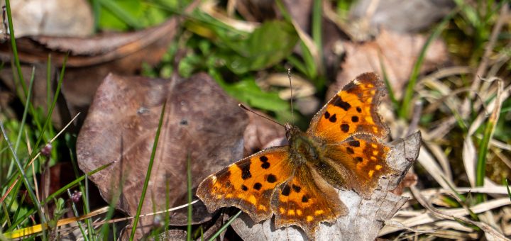 An diesem sonnigen Tag hat sich auch der erste C-Falter wieder im Garten gezeigt und rastete kurz auf dem Rasen in der warmen Sonne.